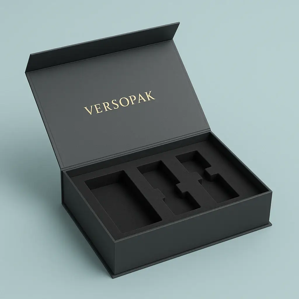 İsteğe göre mıknatıslı kapak, bölmeli iç tasarım ve özel baskı seçenekleriyle üretilir.